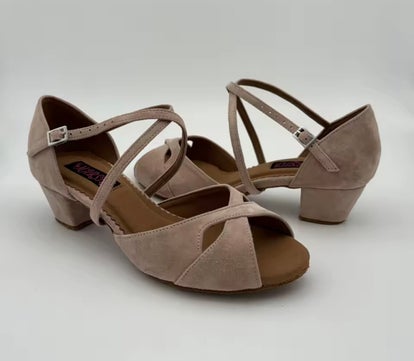 Delightfully soft suede leather dance shoes with simple crossover front straps, and wrap around the foot straps to ensure the foot is secure in the shoe. As shown in the pictures a traditional ankle strap to secure is available to order.
