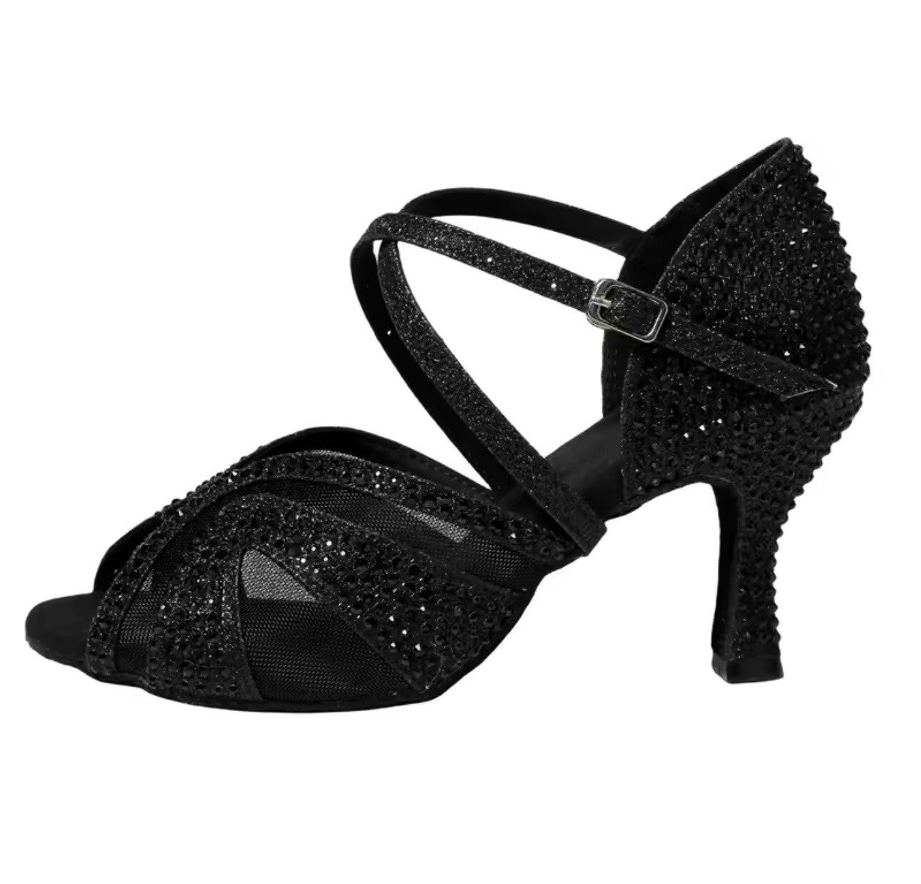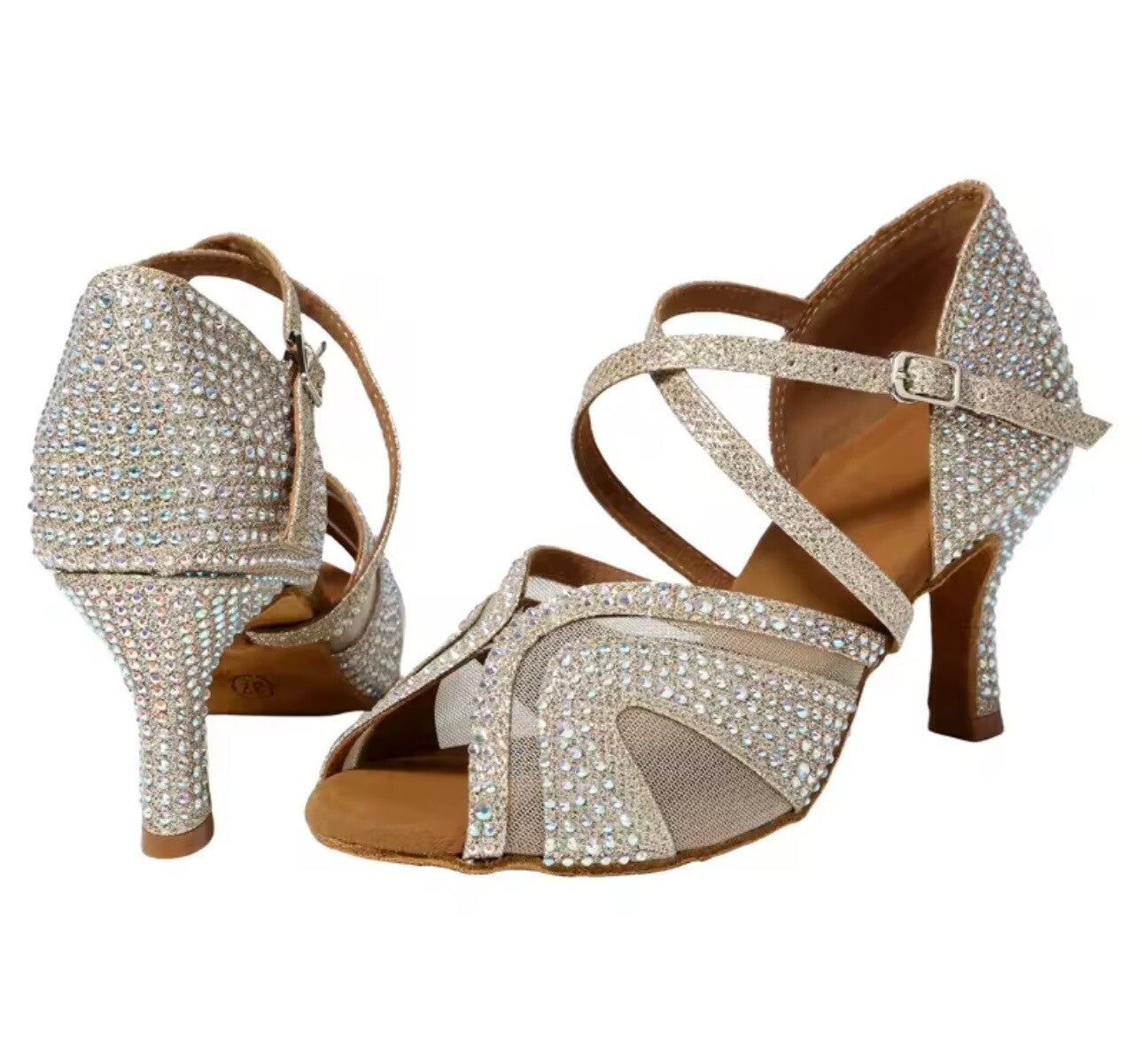 Harper is a beautiful open toe sparkly dance shoe with net and crossover ankle strap to hold the foot securely in place and scattered sparkles. Adjustable easy access hook in fastener.