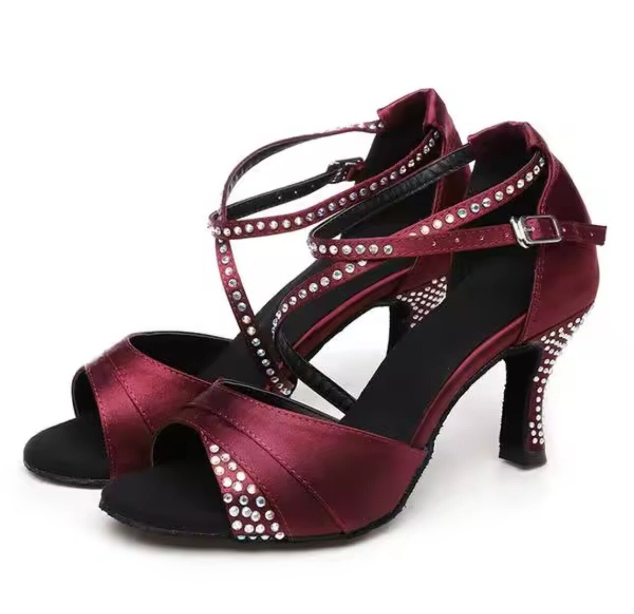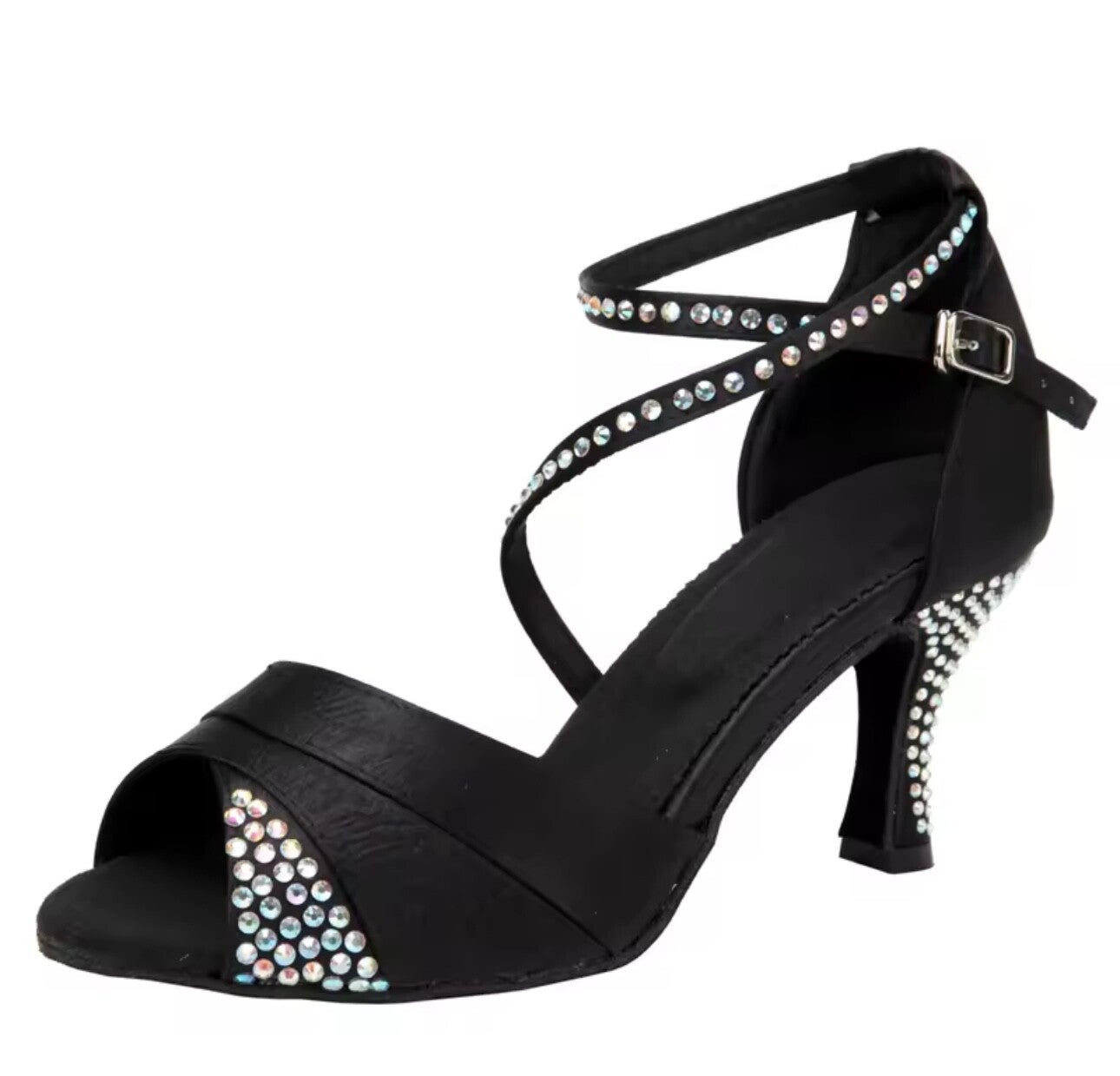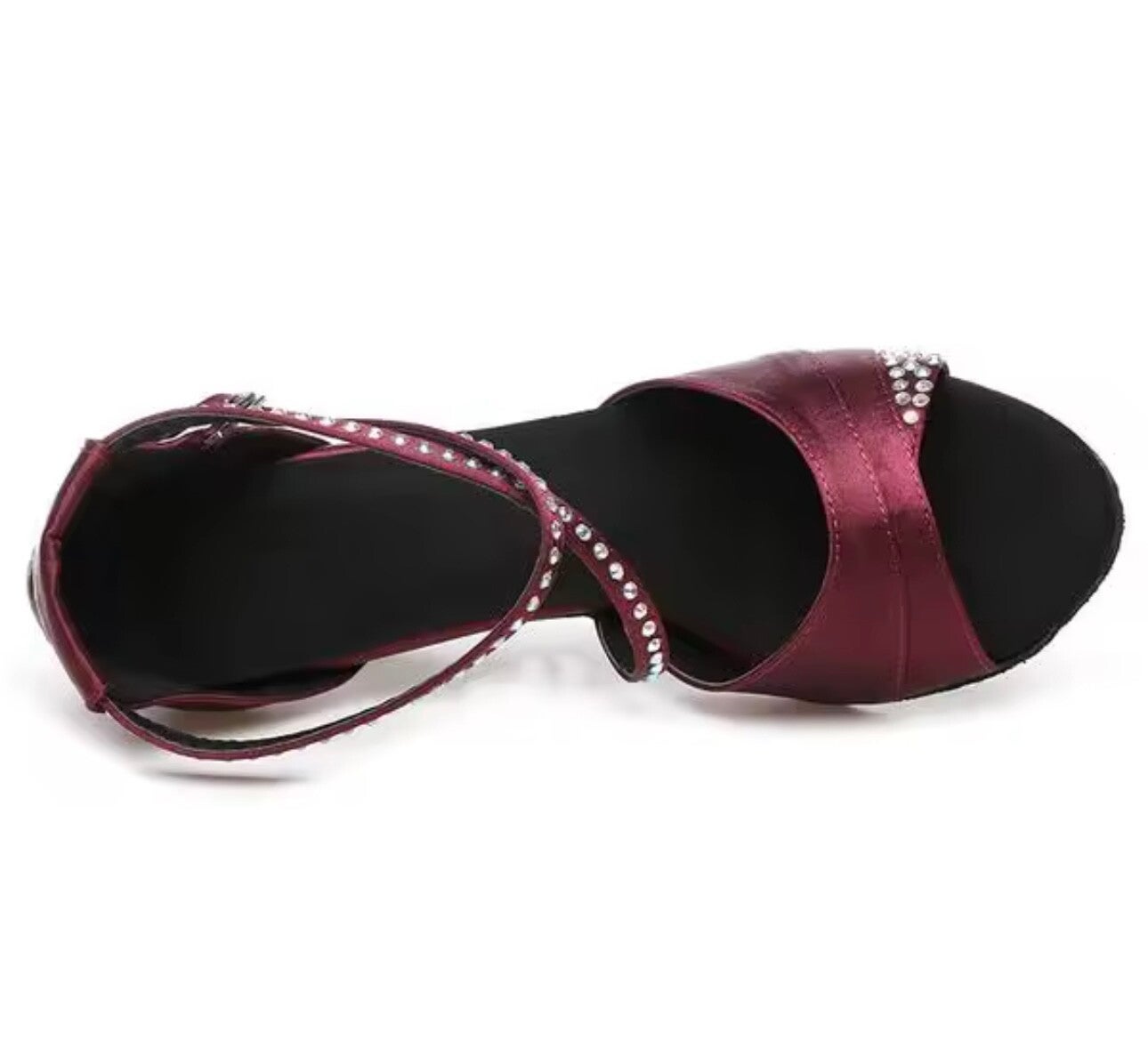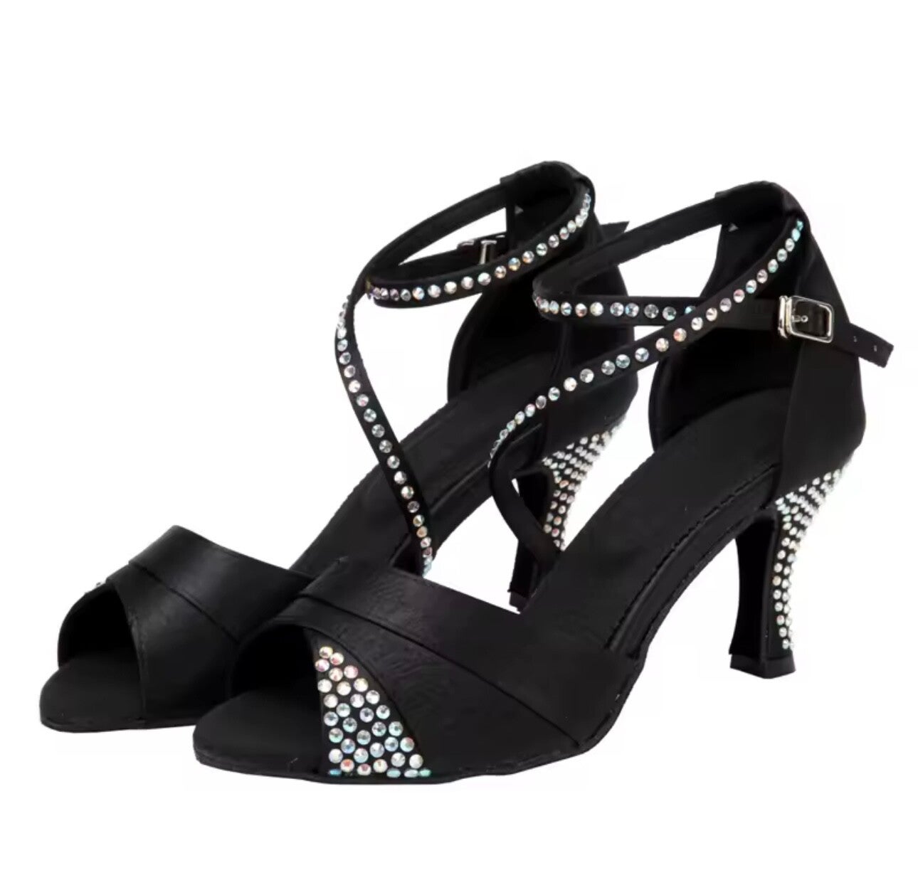 Ophelia is a beautiful, elegant open toe sparkly dance shoe with suede sole and wrap around ankle strap with quick release buckle fastening.