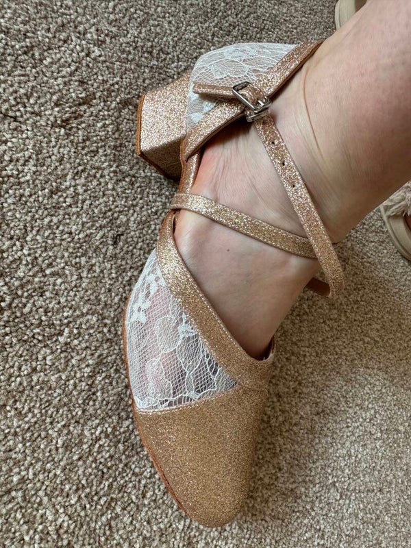 Kathy is a pretty closed toe style shoe, with sparkly fabric and lace.