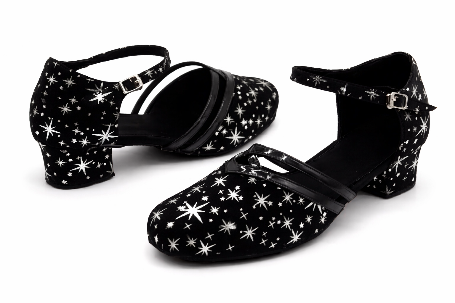 Unusual closed toe low heel dance shoe with silver or gold stars on.
